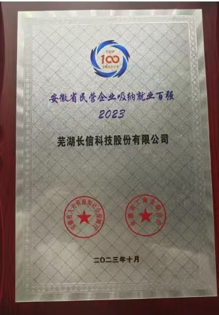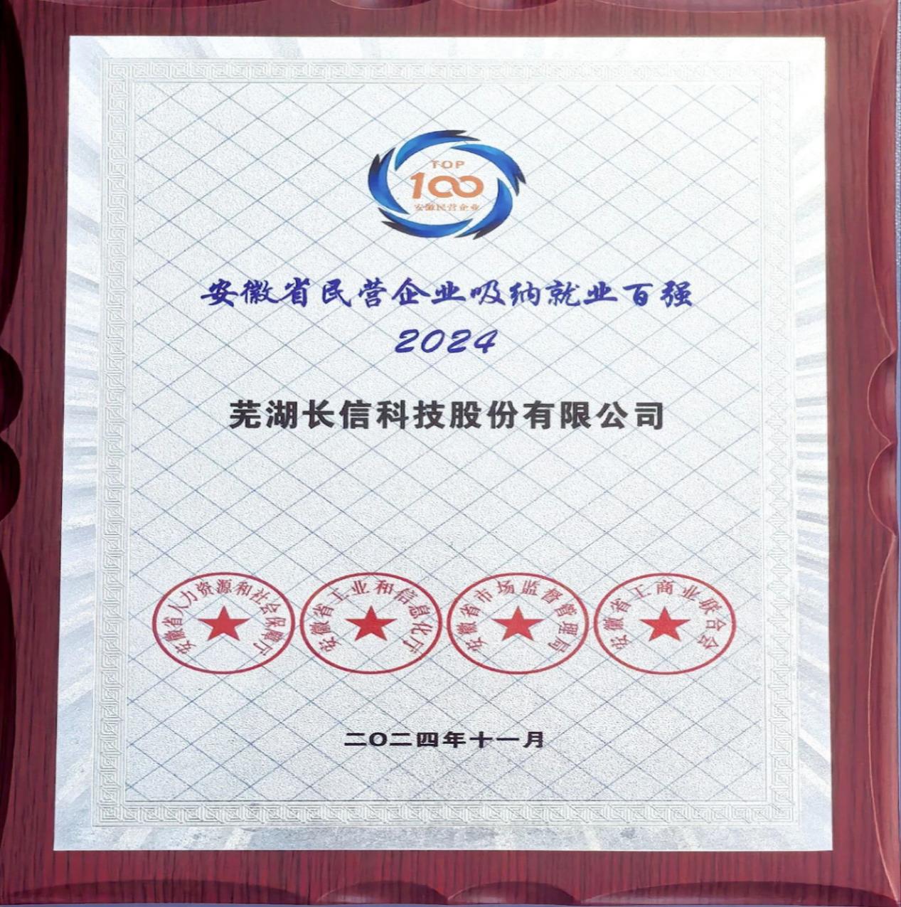 2024年安徽省民营企业吸纳就业百强第23位