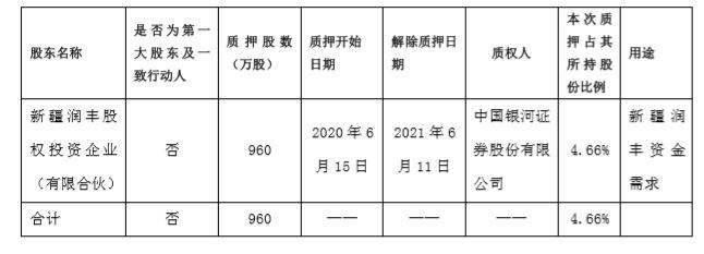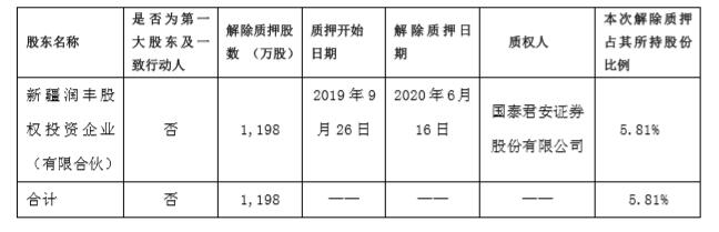 截至公告披露日,新疆润丰持有公司股份20,613万股,占公司总股本的8.45%。