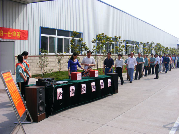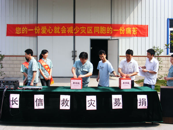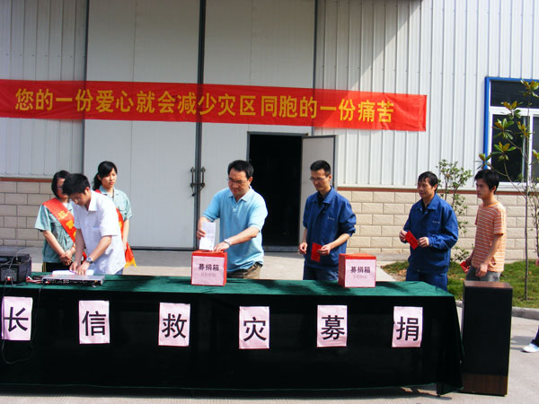 5月19日上午,在悬挂的“您的一份爱心就会减少灾区同胞的一份痛苦”的大型条幅下,公司员工捐款活动正式举行,大家排着长长的队伍,把自己对灾区人民的一份爱心和深切问候之情投入了捐款箱。